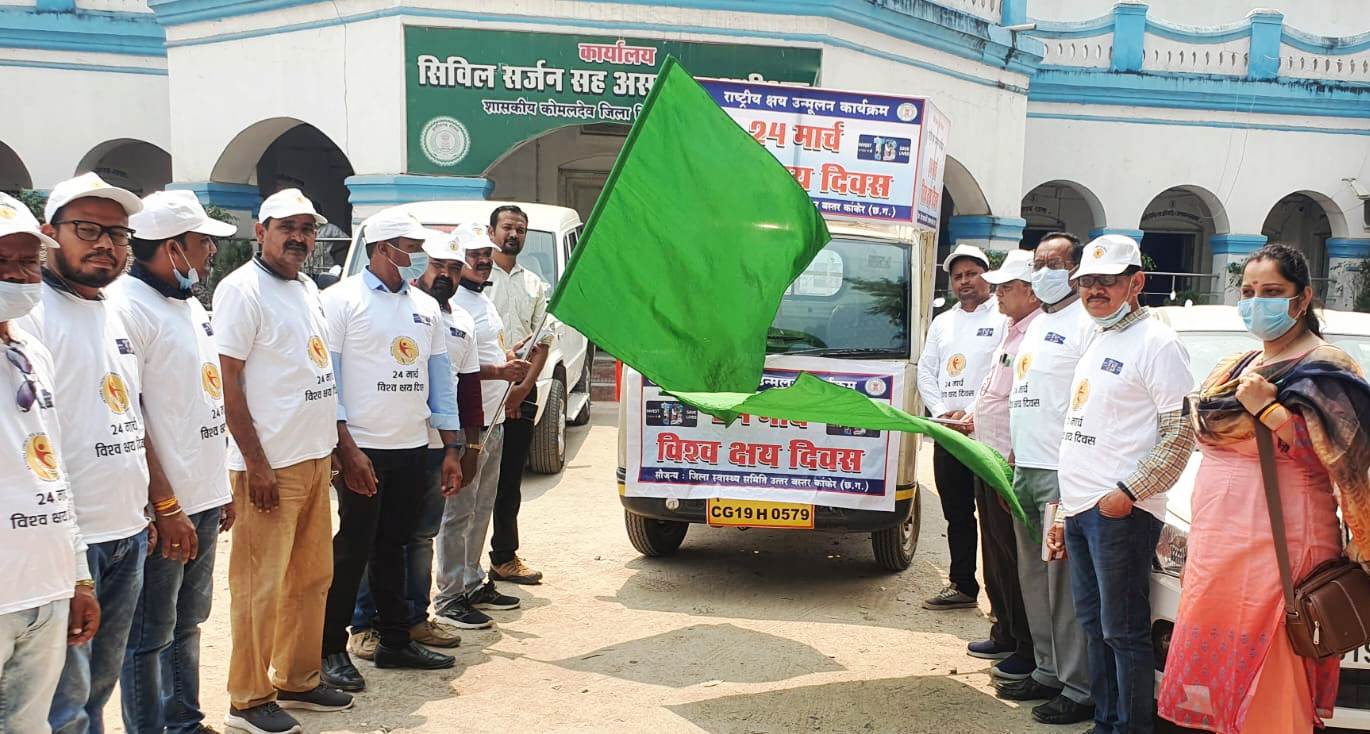 मुख्य चिकित्सा एवं स्वास्थ्य अधिकारी डॉ. जे.एल उईके द्वारा विश्व क्षय दिवस के अवसर पर आज जिला चिकित्सालय कांकेर से जिला क्षय उन्मूलन जागरूकता रथ को हरी झण्डी दिखाकर रवना किया गया। डॉ. उईके ने बताया कि जिले के समस्त हेल्थ एण्ड वेलनेस सेंटरों में कार्यरत सीएचओ के माध्यम से 13 अप्रैल तक टी.बी. बिमारी के संबंध में जागरूकता एवं सघन टीबी खोज अभियान चलाया जायेगा।
