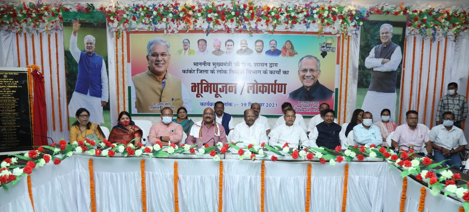 निर्माण कार्यों का भूमिपूजन एवं लोकार्पण कार्यक्रम के अवसर पर विशिष्ट अतिथि छत्तीसगढ़ विधानसभा के उपाध्यक्ष मनोज मण्डावी, संसदीय सचिव एवं विधायक कांकेर शिशुपाल शोरी, विधायक अंतागढ़ अनूप नाग, जिला पंचायत के अध्यक्ष हेमन्त ध्रुव, नगर पालिका परिषद कांकेर के अध्यक्ष श्रीमती सरोज जितेन्द्र ठाकुर, अनुसूचित जनजाति आयोग के सदस्य नितिन पोटाई, छत्तीसगढ़ पर्यटन बोर्ड के सदस्य नरेश ठाकुर, छत्तीसगढ़ गौसेवा आयोग के सदस्य नरेन्द्र यादव, जिला पंचायत के उपाध्यक्ष हेमनारायण गजबल्ला और जिला पंचायत के पूर्व अध्यक्ष श्रीमती सुभद्रा सलाम, बस्तर संभाग के कमिश्नर जी.आर. चुरेन्द्र, कलेक्टर कांकेर चन्दन कुमार उपस्थित थे। मुख्यमंत्री भूपेश बघेल द्वारा कांकेर जिले में लोक निर्माण विभाग द्वारा निर्मित किये जाने वाले पीढ़ापाल से धंनसुली मार्ग 03 किलोमीटर, कांकेर-भानुप्रतापपुर-संबलपुर मार्ग पर किलोमीटर 16/10 से 20/6 तक मजबूतीकरण 04 नग पुलिया सहित, कुष्टीकुर से आलबेड़ा मार्ग पर 05 किलोमीटर पुल-पुलिया सहित, अभनपुर-मांलगाव मार्ग के किलोमीटर 1/16 पर महानदी पर पुल निर्माण, कोदाभाट-झुनियापारा-मोहपुर मार्ग के किलोमीटर 2/10 हटकुल नदी पर पुल निर्माण, करियापहर-भजनाहालारी मार्ग के किलोमीटर 3/8 पर झुरानाला में पुल निर्माण, शासकीय महाविद्यालय नरहरपुर का भवन निर्माण, ग्राम पंचायत बेंवरती में 200 सीटर आवासीय विद्यालय भवन निर्माण, ग्राम साल्हेटोला ग्राम पंचायत सारवंडी में 200 सीटर आवासीय विद्यालय भवन निर्माण, दमकसा से पेटेचुआ मार्ग 08 किलोमीटर पुल-पुलिया सहित, कोटेला से हटकाचारामा मार्ग 03 किलोमीटर पुल-पुलिया सहित, कांकेर-भानुप्रतापपुर-संबलपुर मार्ग के किलोमीटर 29 से 55 में 15 किलोमीटर उन्नयन कार्य, भानुप्रतापपुर-दुर्गूकांदल-पखांजूर-बांदे मार्ग के 11 किलोमीटर से 19 में 09 किलोमीटर में मजबूतीकरण, दुर्गूकोंदल में 200 सीटर आवासीय विद्यालय भवन निर्माण, कलगांव पहुंच मार्ग 02 किलोमीटर पुल-पुलिया सहित, हरनगढ़ बाजार पारा से मरकाम पारा मार्ग 04 किलोमीटर पुल-पुलिया सहित, छोटेबेठिया में 200 सीटर आवासीय विद्यालय भवन निर्माण, कोयलीबेड़ा-दुता मार्ग के किलोमीटर 1/4 पर मेढ़की नदी पर पुल निर्माण, सिकसोड़-चारागांव मार्ग के किलोमीटर 7/4 पर चारगांव नदी पर पुल निर्माण, कर्रेगांव-मंडागांव-भैसासुर मार्ग के किलोमीटर 3/4 पर मंडागांव नदी पर पुल निर्माण, पी.व्ही.-112 देवीपुर से देवदा मार्ग के देवदा नाला में पुल निर्माण, पी.व्ही.-44 से पी.व्ही.-45 के किलोमीटर 1/6 अंजाड़ी नाला में पुल निर्माण, सोनपुर-नारायणपुर-मरोड़ा मार्ग के किलोमीटर 78 में कोटरी नदी पर पुल निर्माण का भूमिपूजन वर्चुअल माध्यम से किया गया। इसके साथ ही मुख्यमंत्री बघेल द्वारा कांकेर के लोक अभियोजन क