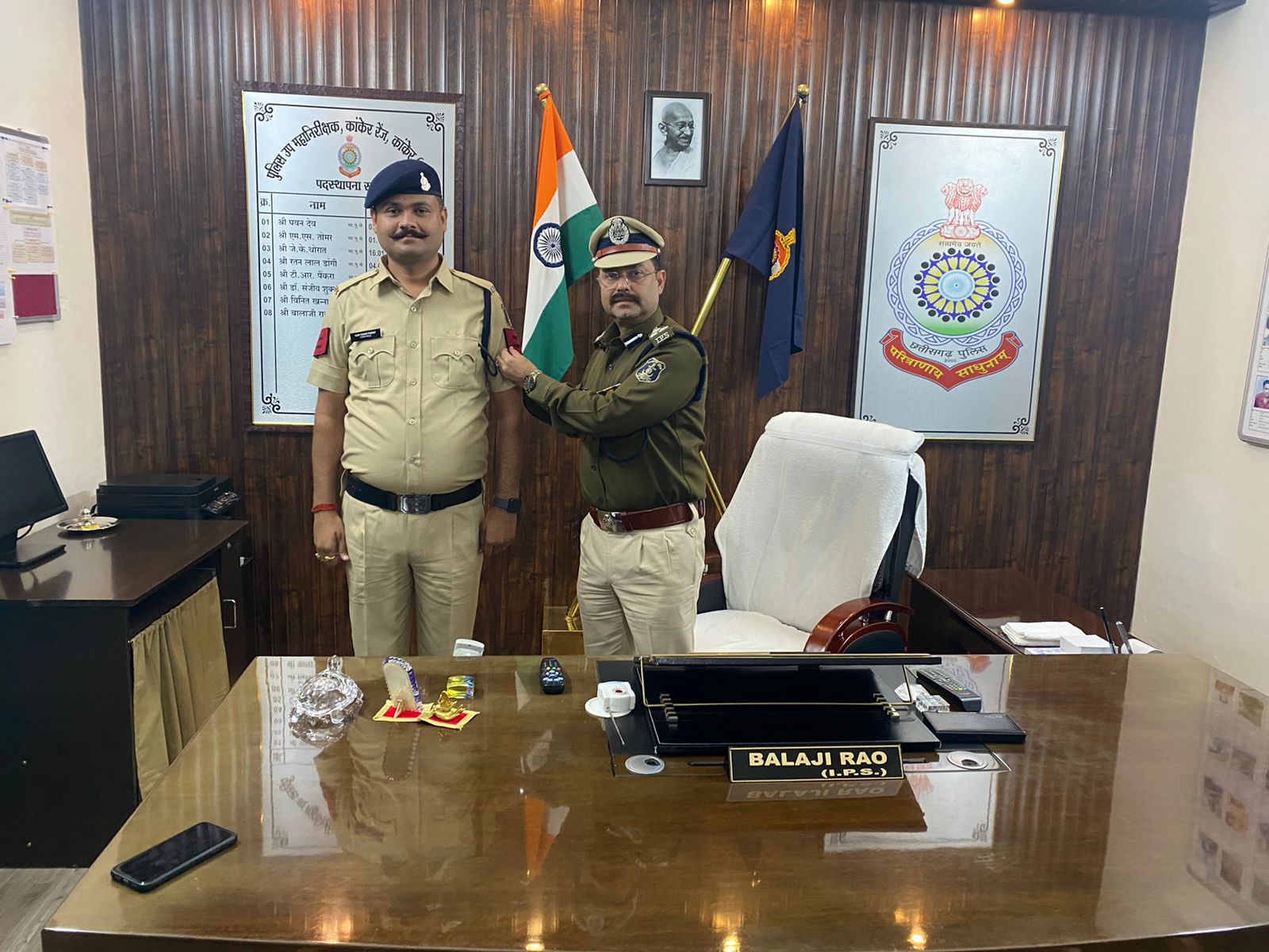 कांकेर में पदस्थ 160 आरक्षकों को पी. पी. कोर्स उर्त्तीण होने के उपरांत आरक्षक से प्रधान आरक्षक के पद पर पदस्थ किया गया। बालाजी राव उप पुलिस महानिरीक्षक कांकेर रेंज, शलभ कुमार सिन्हा पुलिस अधीक्षक कांकेर, जी.एन. बघेल अतिरिक्त पुलिस अधीक्षक कांकेर, धीरेंद्र पटेल अतिरिक्त पुलिस अधीक्षक पखांजूर, अमृत कुजूर उप पुलिस अधीक्षक नक्सल ऑपरेशन कांकेर, प्रशांत सिंह पैकरा अनुविभागीय अधिकारी पुलिस भानूप्रतापपुर, मयंक तिवारी अनुविभागीय अधिकारी पुलिस पखांजूर, अमरनाथ सिदार अनुविभागीय अधिकारी पुलिस अंतागढ़ द्वारा पदोन्नत हुए कर्मचारी को फीता लगाकर बधाई एवं उज्जवल भविष्य की शुभकामनाएं दी गई। साथ ही मेहनत और लगन से बेहतर कर्तव्य निर्वाह हेतु प्रोत्साहित किया गया।